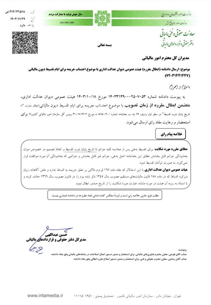 ابطال مقرره احتساب جریمه برای ایام تقسیط دیون مالیاتی – بخشنامه 212/23568/ص مورخ 29/11/1403