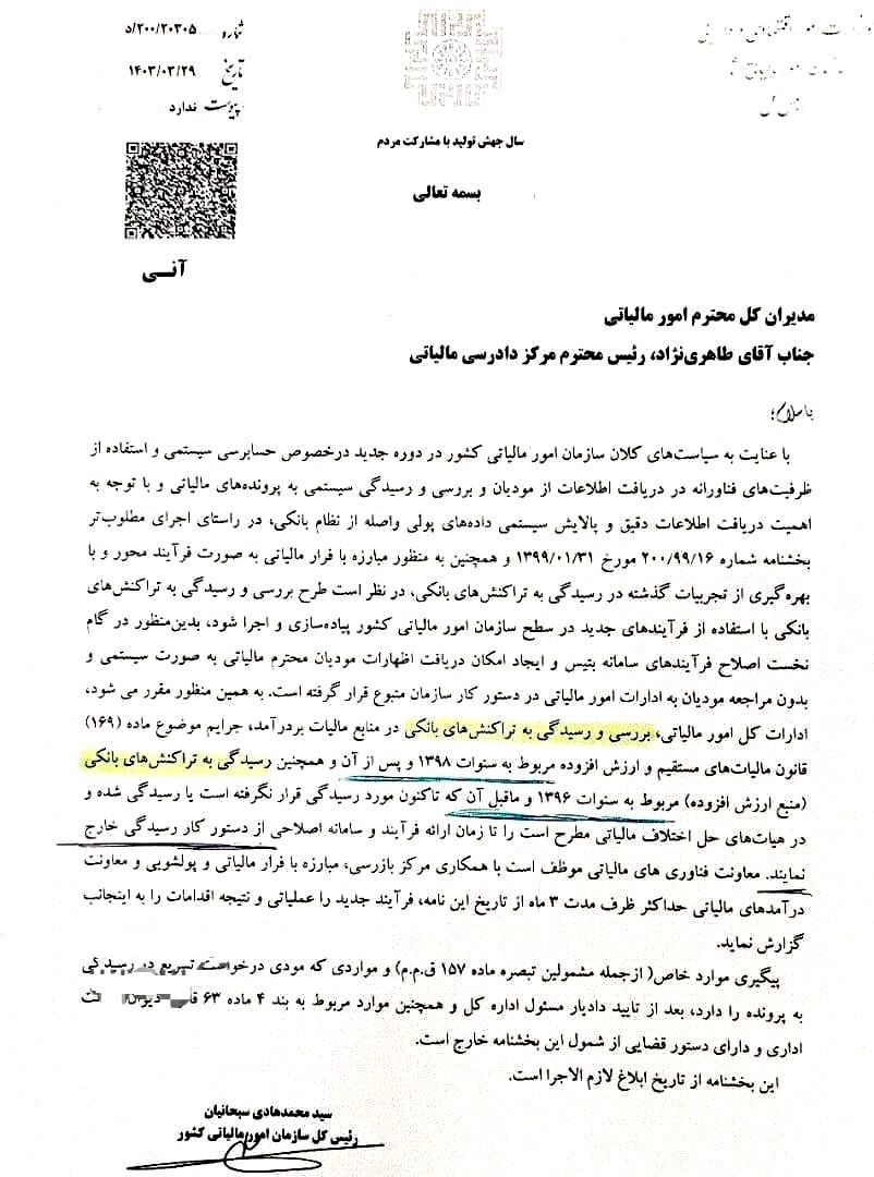 در خصوص رسیدگی به تراکنش های بانکی  – بخشنامه ۲۰۰/۲۰۳۰۵ مورخ 29/03/1403