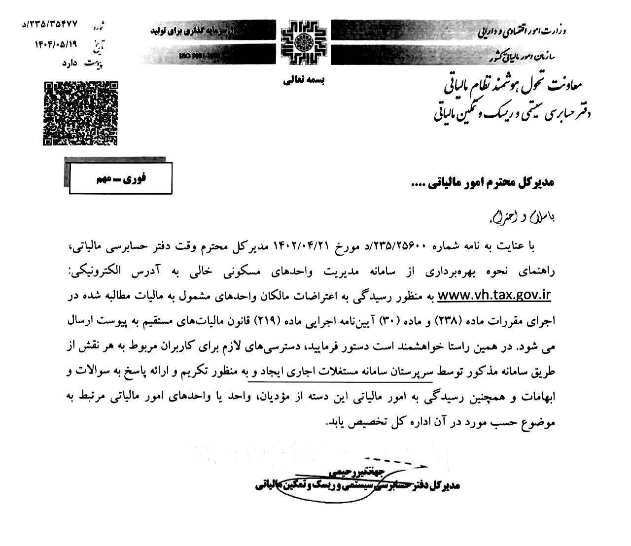 سامانه‌ای به نشانی https://www.tax.gov.ir  برای رسیدگی به اعتراض مالکان نسبت به مالیات واحدهای مسکونی خالی راه‌اندازی شده است. ادارات مالیاتی موظف‌اند دسترسی کاربران مرتبط را فعال کرده و پاسخگویی به مؤدیان را در چارچوب مواد ۲۳۸ و ۳۰ آیین‌نامه اجرایی ماده ۲۱۹ قانون مالیات‌های مستقیم انجام دهند | مطالعه بیشتر